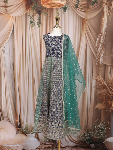 Navy Blue Floral Design Heavy Embroidered Net Lehenga - Diadem