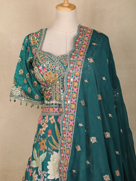 Exude elegance with our lehenga for Mehendi function embellished with sequins and beads, meticulously arranged for an eye-catching effect. The luxurious fabric base and vibrant embellishments create a stunning visual, perfect for a high-energy mehendi event.