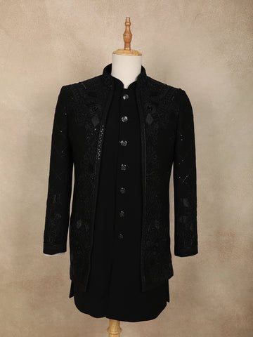 Black Floral Embroidered Viscose Sherwani Suit - Diadem