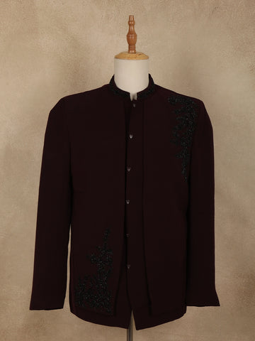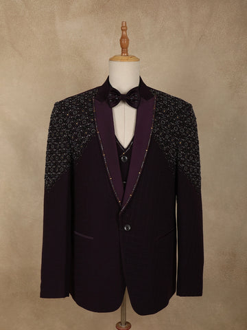 Take your pick from our wine cotton blend suit design for men, complemented by a matching tie and brooch.
