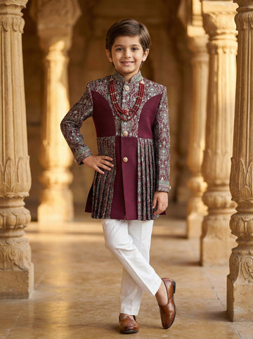 Wine Velvet Deer Design Bead Work Sherwani and Pant Set - Diadem