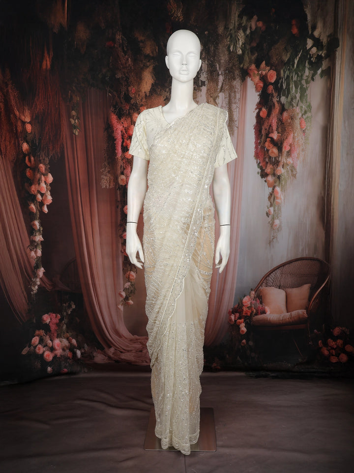 Experience classic elegance with our modern net saree in white hue. Its pristine colour and refined material create a perfect net saree look of timeless grace for any special occasion.