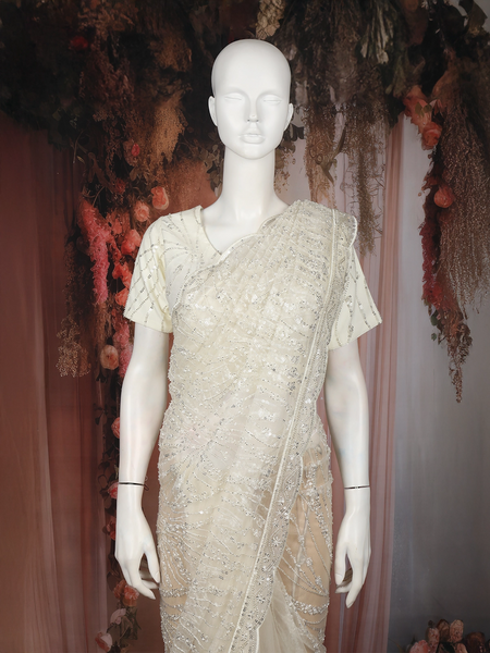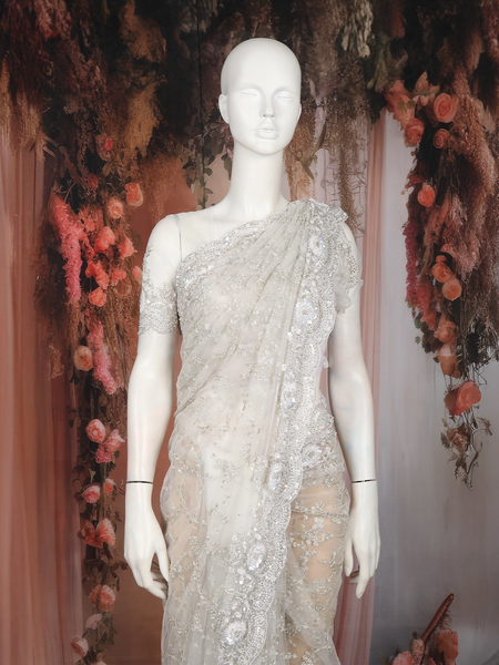 Make a statement at your reception in a stunning and modern net saree from Ashirah by Diadem. The sheer fabric, embellished with sparkling details, creates an enchanting net saree look that catches the light beautifully. Ideal for those who want to stand out and celebrate their special occasion with an air of elegance.