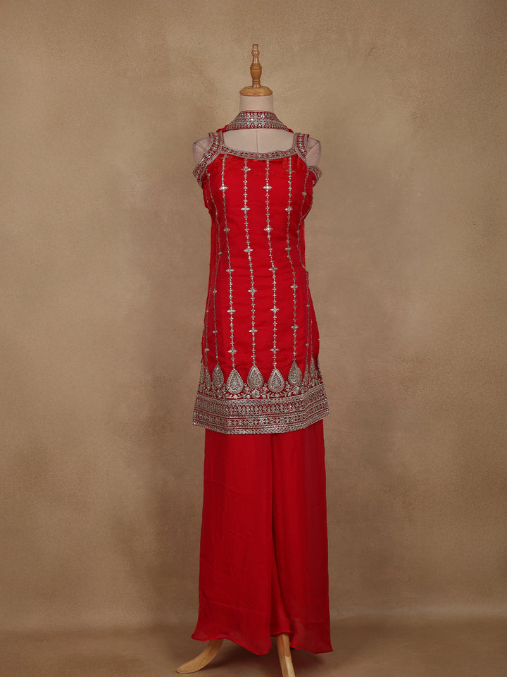 Red Floral Embroidered Coat And Palazzo Set For Girls - Diadem