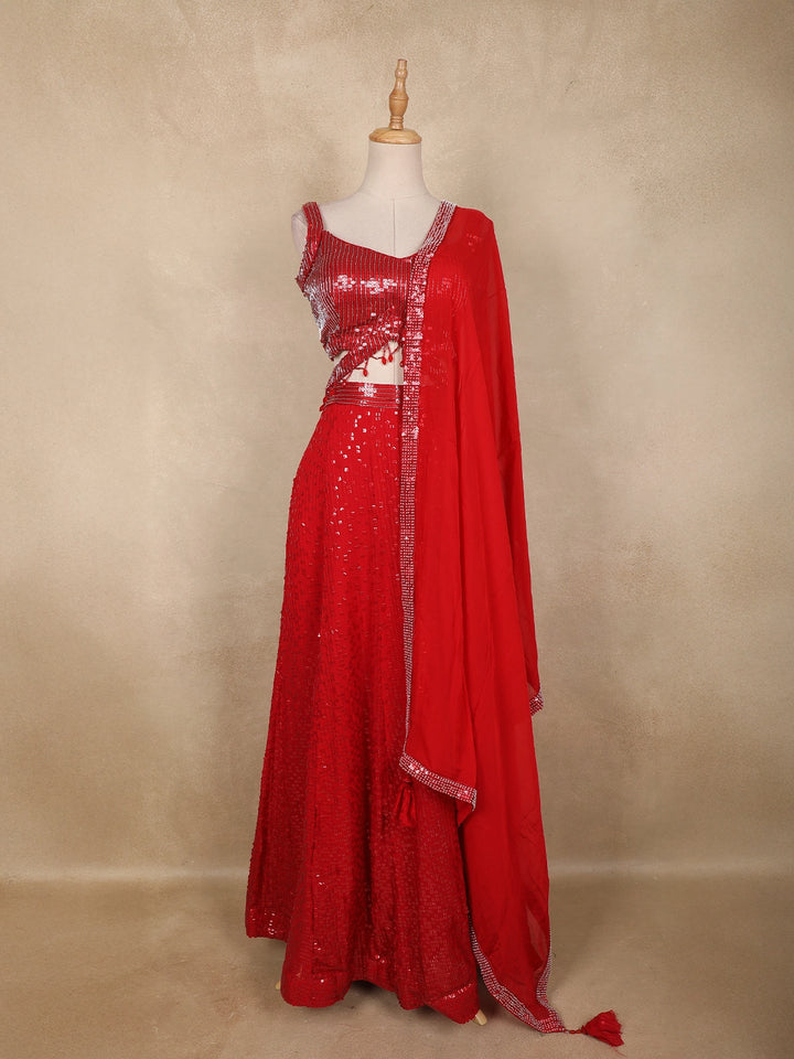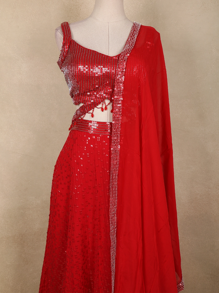 Why choose between traditional and modern when you can have both? The party wear Indo-Western lehenga blends ethnic aesthetics with contemporary styles. Think asymmetrical hemlines, crop tops, and modern draping. It’s the ultimate fusion look for those who want to stand out with unique style.