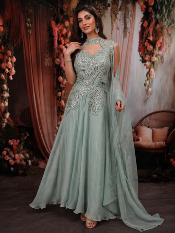 Make a bold style statement with a party wear lehenga jacket! The lehenga and jacket combo is perfect for adding warmth and a touch of sophistication. Pairing a richly embellished jacket with a lehenga brings both elegance and versatility, making it a go-to choice for cooler evening events.