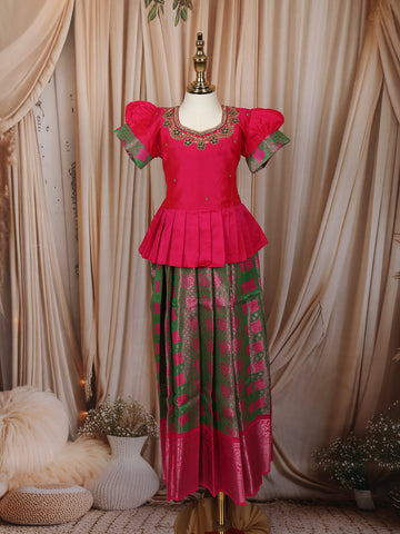 Motifs like vines, leaves, birds, and butterflies often adorn designer pattu pavadai for kids. These nature-inspired elements create a beautiful and lively aesthetic, suitable for both festive and casual occasions.