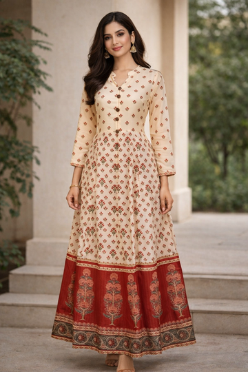 Anarkali prints bring drama in the most wearable way. They feel festive without needing heavy embellishments.