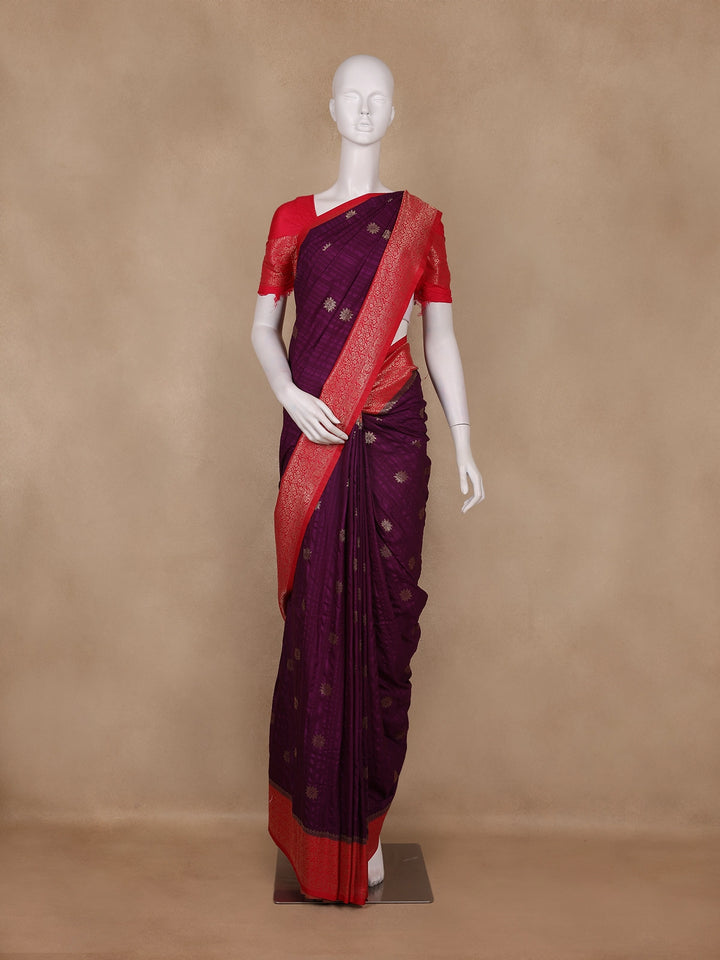 Dark Purple Floral Butta Woven Pure Kanchipuram Silk Saree with Red Contrast Zari Border - Diadem