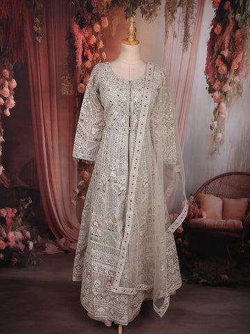 Our sophisticated Indian bridal reception gowns in a grey hue exude calm elegance and timeless grace, perfect for a modern yet classic reception look.