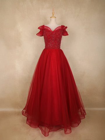 Upgrade your formalwear collection with our red ball gowns, featuring a voluminous skirt crafted from high-quality tulle and satin. The structured bodice of this red gown design guarantees an excellent fit, while intricate beadwork adds a touch of glamour. Ideal for grand events and elegant soirées.