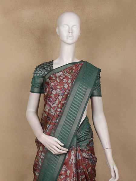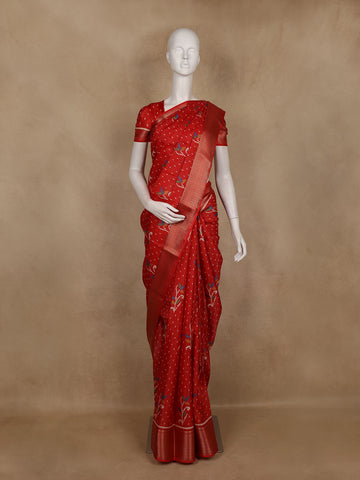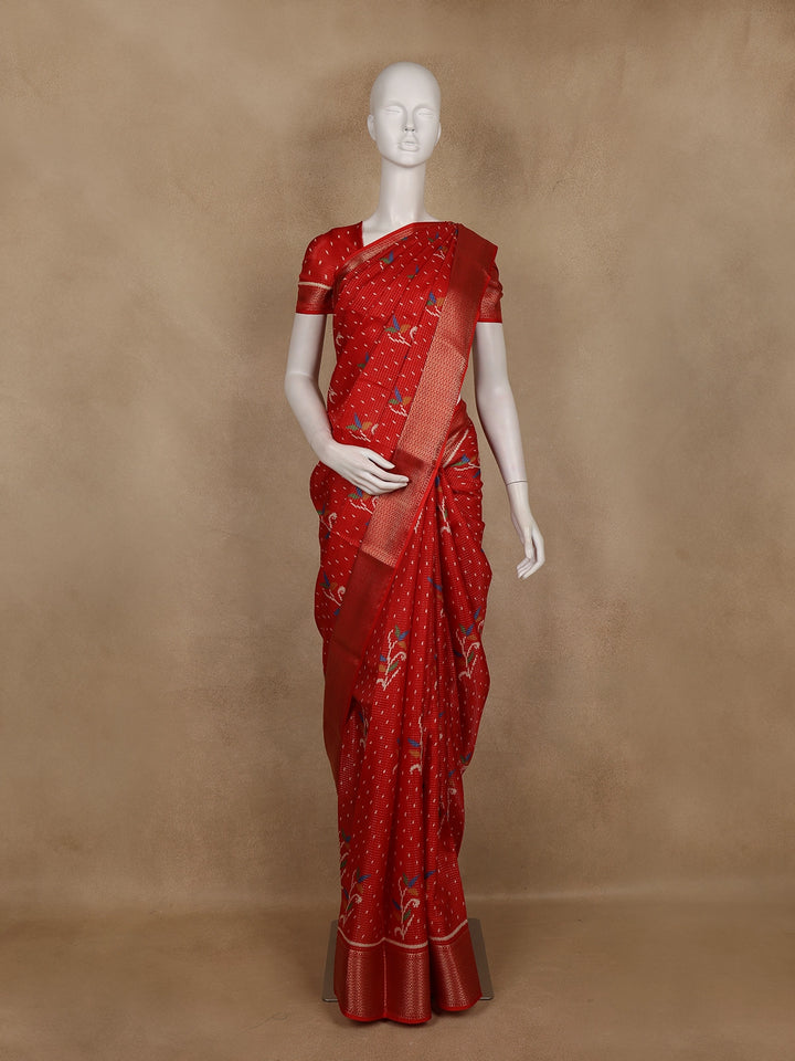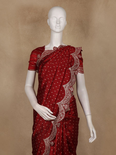 Dark Red Floral Designed Raw Silk Saree - Diadem