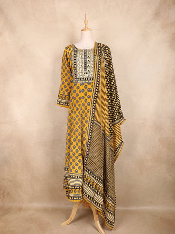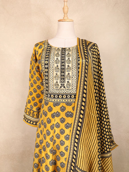 Yellow Floral Designed Cotton Rayon Anarkali Salwar Suit - Diadem