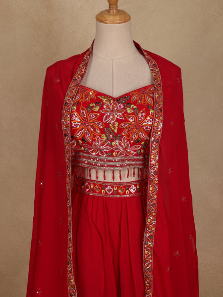 Complete your look with jhumkas, a matching dupatta, embroidered footwear, and a chic updo for a stunning festive appearance.