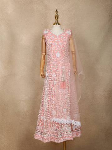 Peach Mirror Work Georgette Kids Palazzo Suit - Diadem