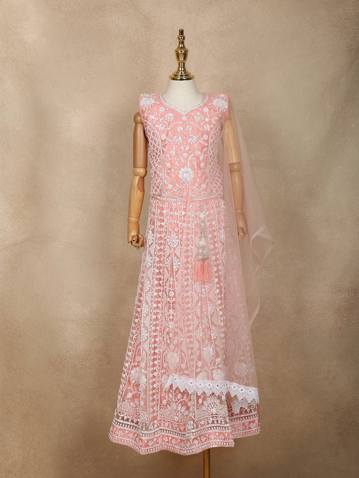 Peach Net Sequins And Floral Embroidery Bridesmaid Lehenga - Diadem
