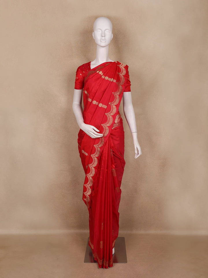 Red remains a timeless choice for wedding sarees for brides, symbolising love and prosperity. Our bridal silk sarees in red feature intricate zari and brocade work for a royal look.