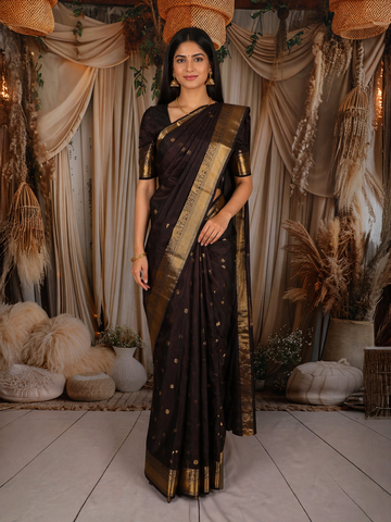 Our collection includes authentic Kanchipuram silk sarees, Banarasi sarees, organza sarees, and soft silks that blend traditional motifs with subtle modern finishes.