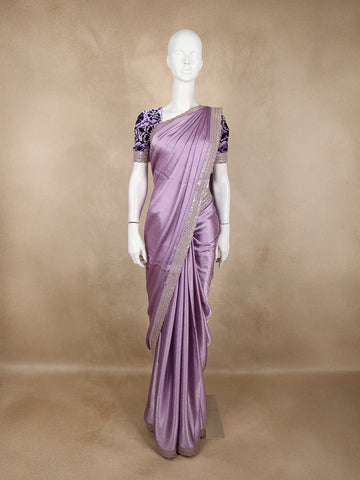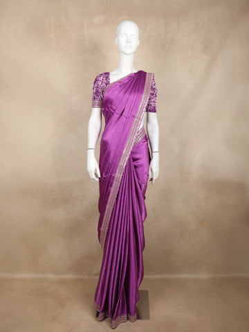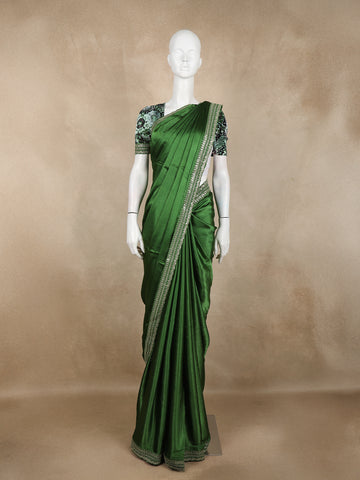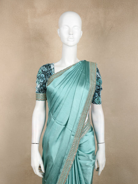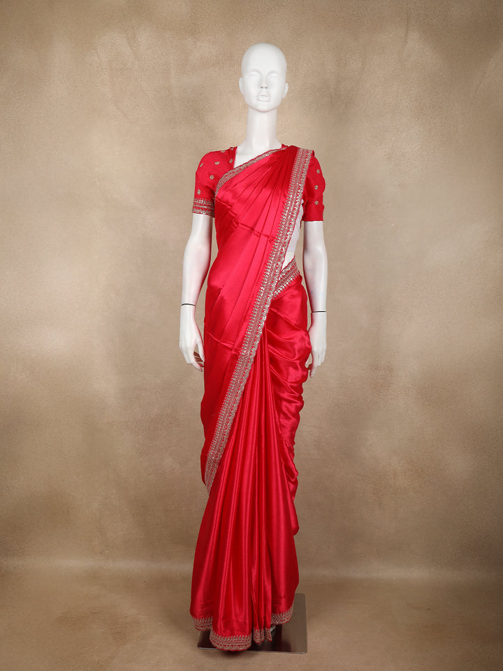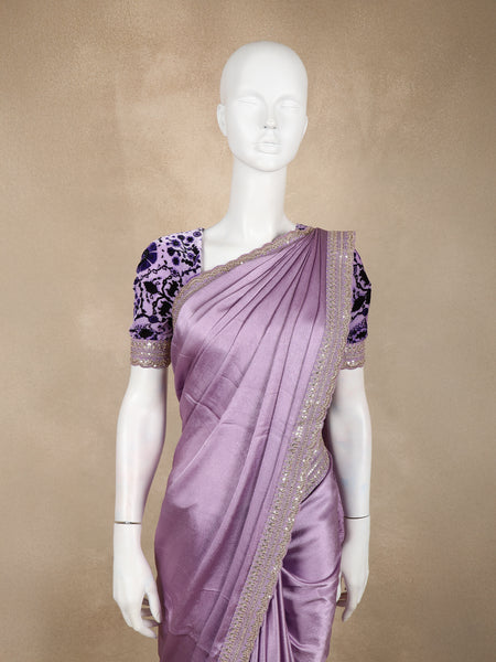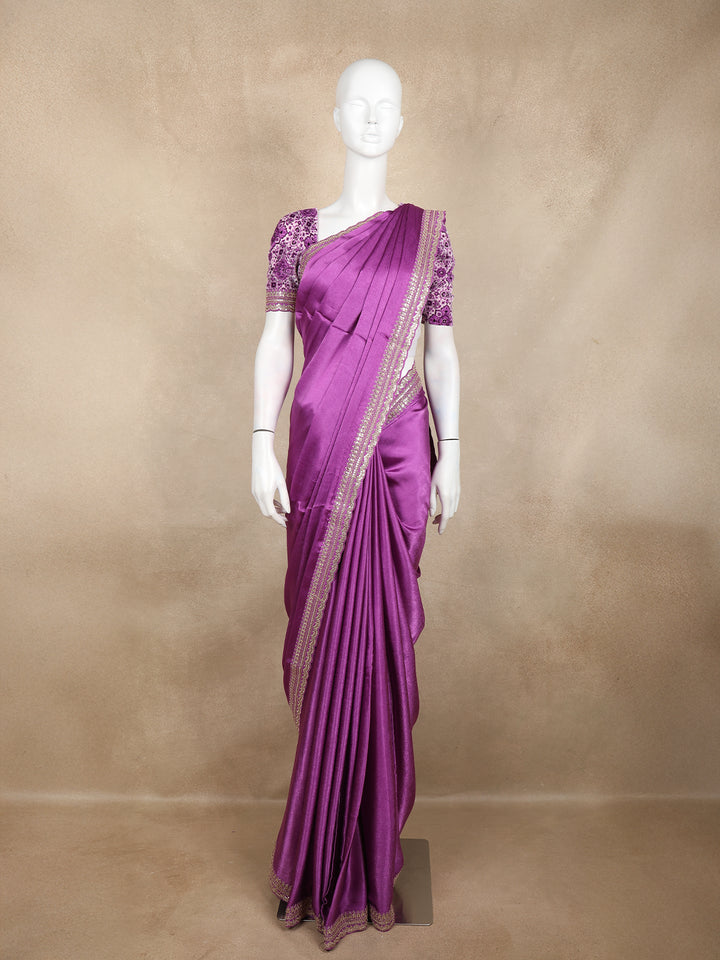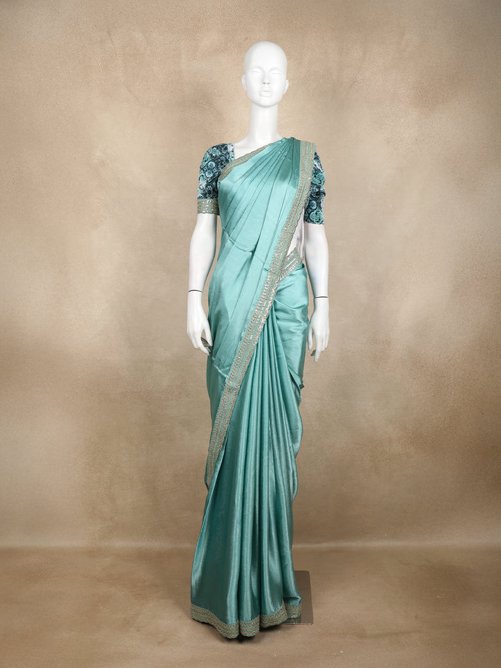 Navy Blue Solid Designed Satin Saree With Scalloped Border - Diadem