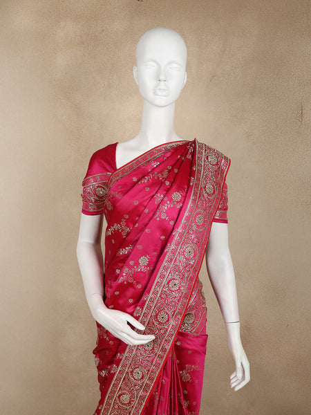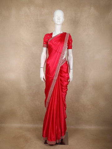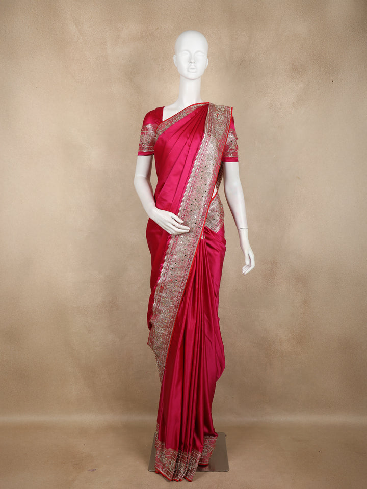 Black Stone Embellished Satin Saree With Scalloped Border - Diadem