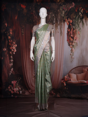 Leaf Green Semi Silk Stripes And Floral Printed Saree - Diadem