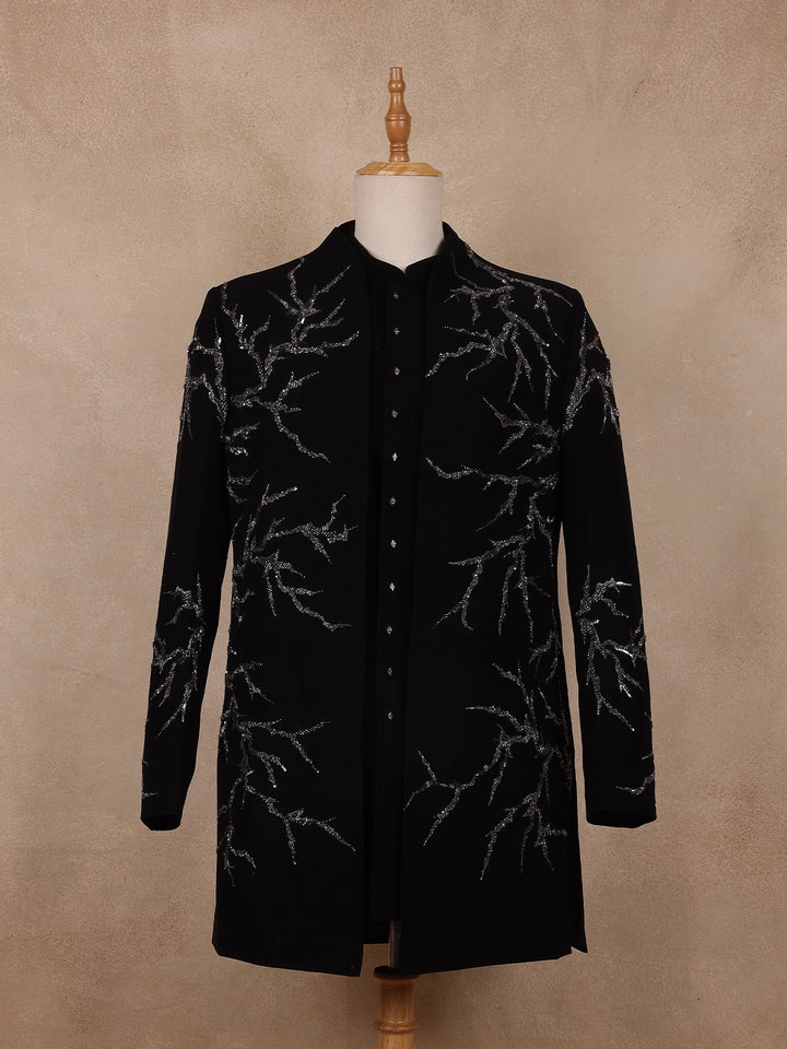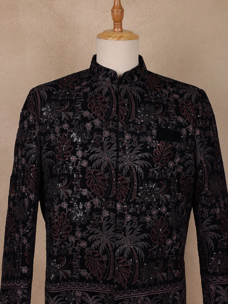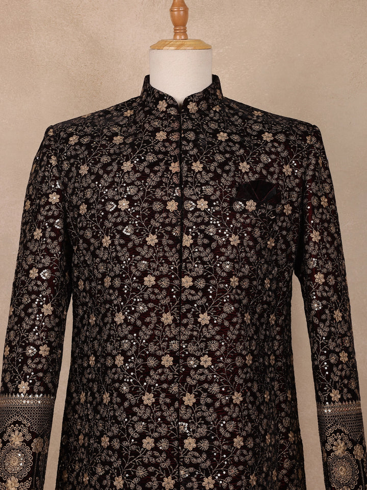 Black Floral Embroidered Viscose Sherwani Suit - Diadem