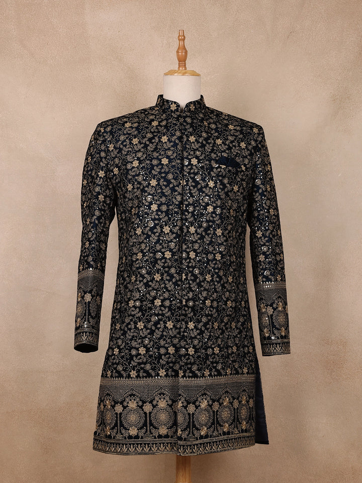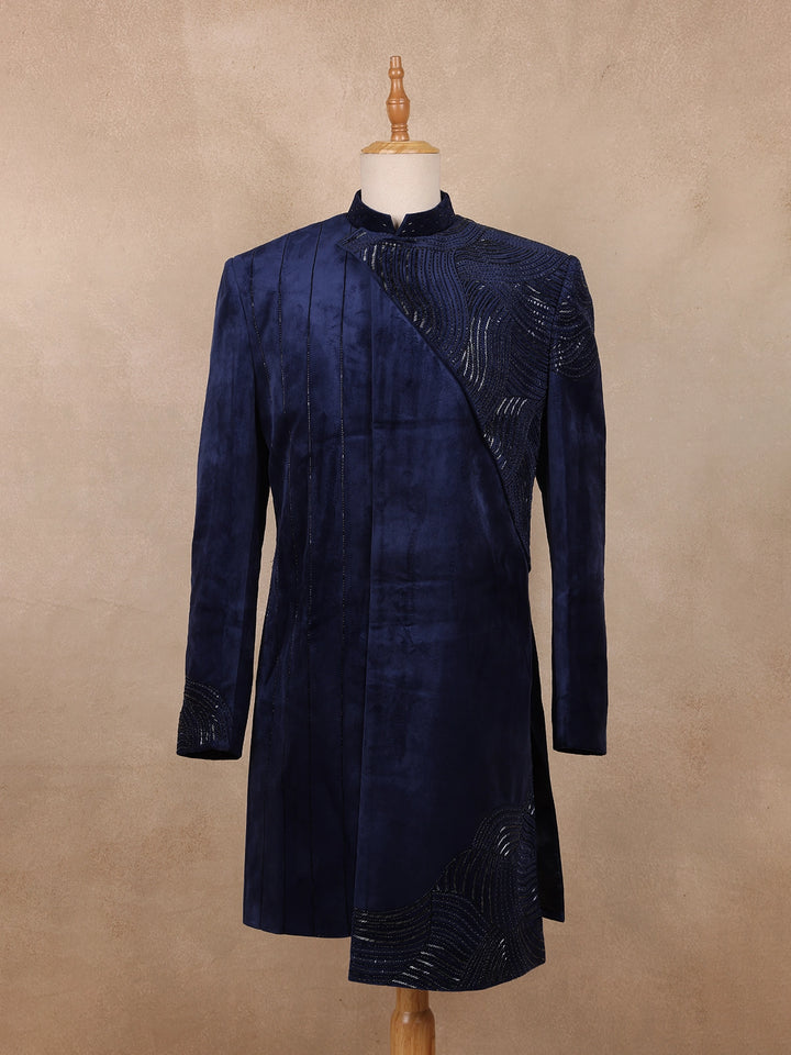 Make a statement with our elegant blue men's sherwani, ideal for any traditional event or modern celebration. Experience the perfect fusion of style and sophistication!