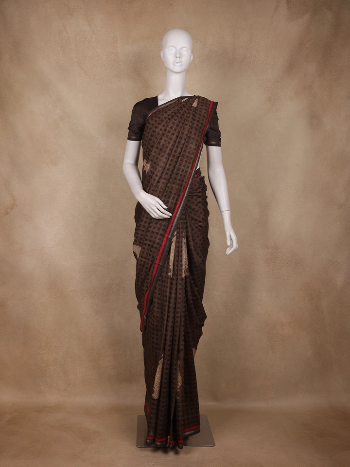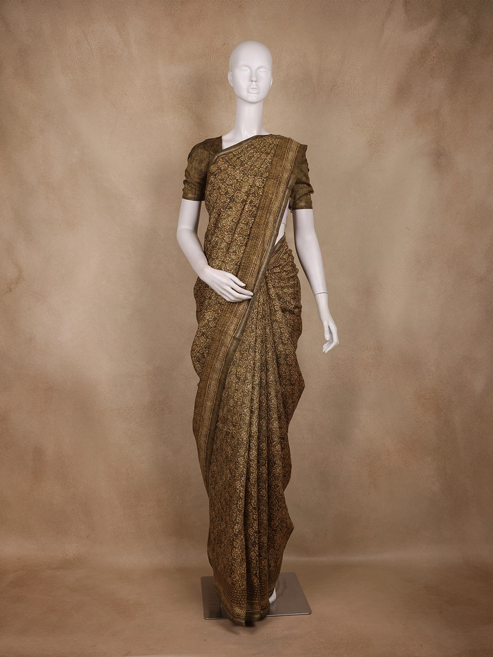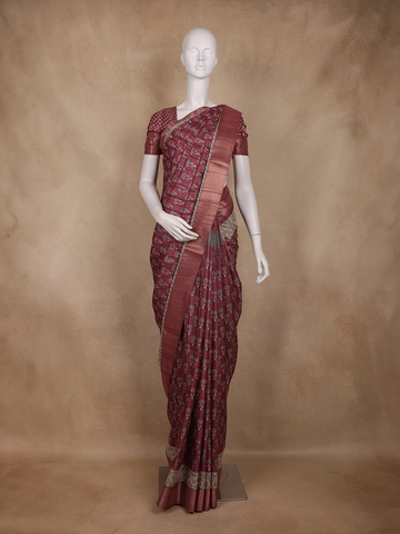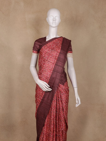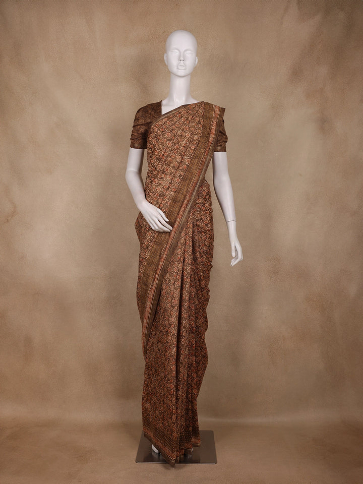 The sandal semi tusaar silk saree's natural hue captivates with its warmth, complementing various skin tones. Crafted from semi tussar silk, it reflects luxury and elegance effortlessly.