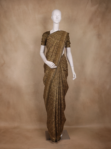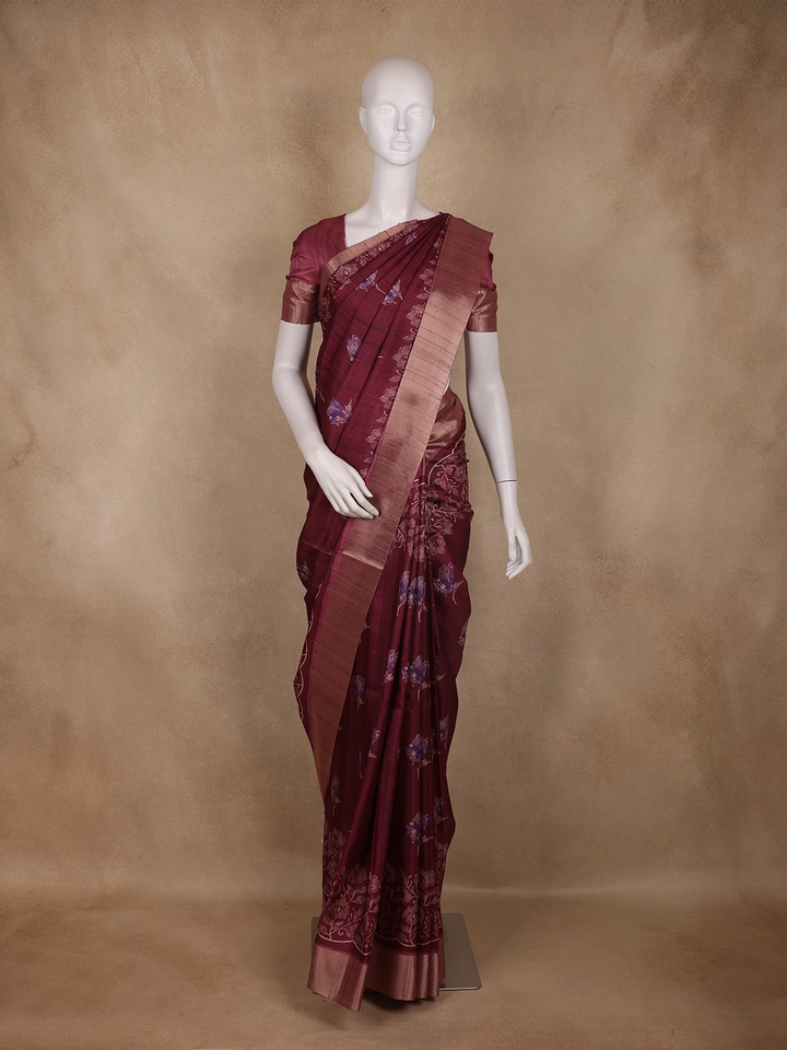 The floral design of Tussar silk sarees offers a charming appeal, displaying delicate blooms that exude grace and femininity. Ideal for weddings or formal gatherings, this design can be styled with minimalist jewellery and a sleek hairdo for a sophisticated look.