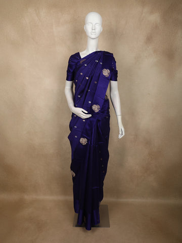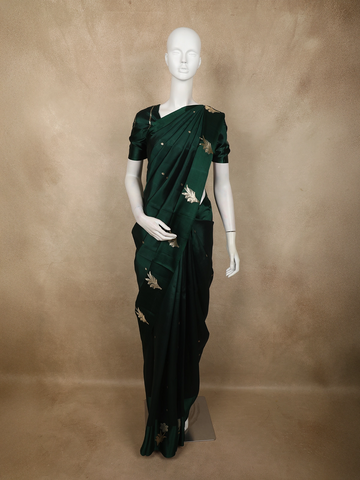Traditional motifs include floral vines, paisleys, Mughal-inspired jaals, and symbolic elements like peacocks and kalgas. These motifs are not decorative alone; they create rhythm across the saree, guiding the eye from border to pallu.