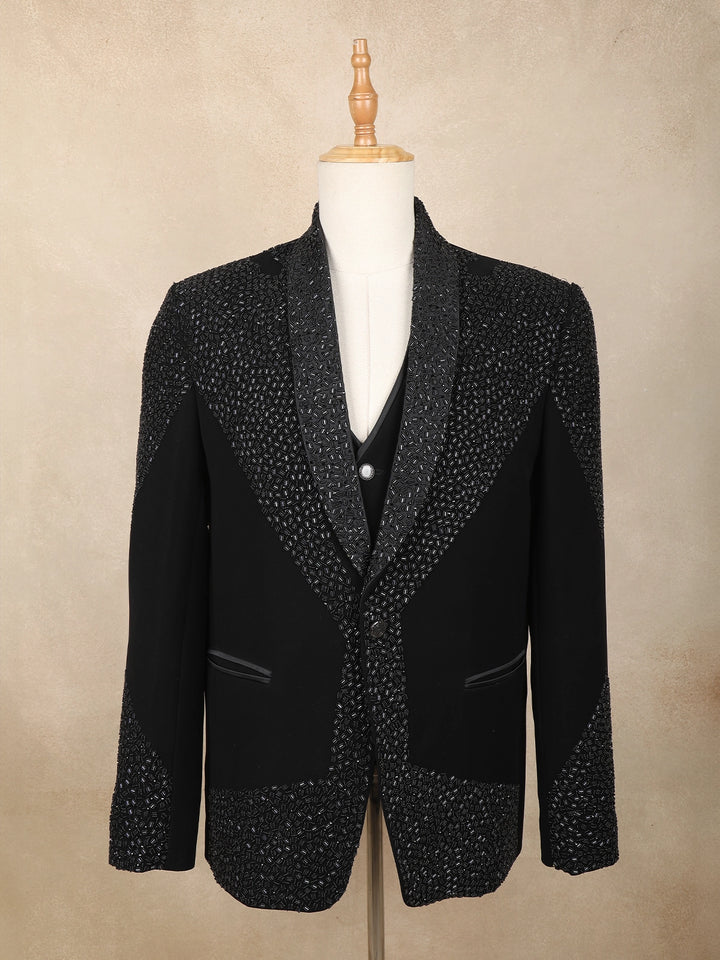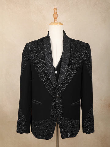 Indian wedding suits for men from Diadem remain timeless and elegant, with this season highlighting three-piece options in classic colours like royal blue, dark red, and classic black.