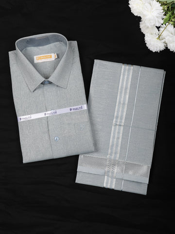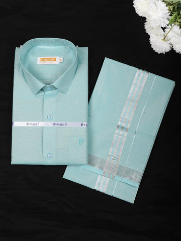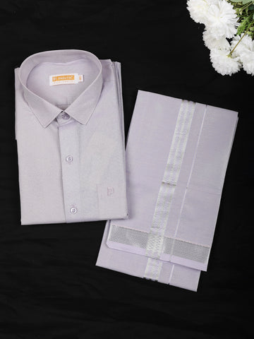 Experience the magic of tradition with Diadem's plain semi-silk full-sleeve shirt and matching dhoti set, the perfect South Indian wedding dress for males.