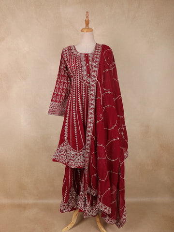 Dark Red Georgette Floral Designed Bridesmaid Lehenga - Diadem