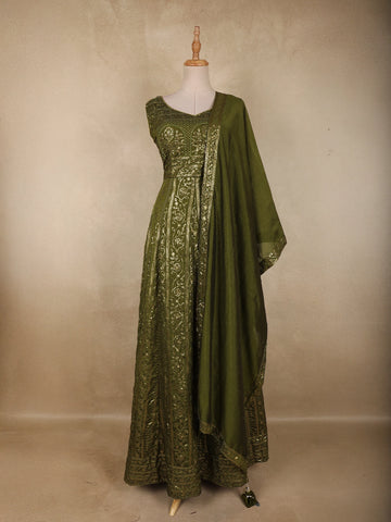 Olive Green Gown With Embroidered Mirror Work Jacket - Diadem