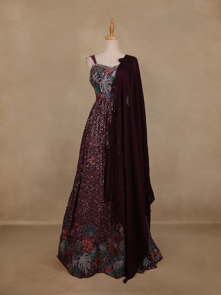 Wine Maroon Floral Embroidery Net Bridal Gown - Diadem
