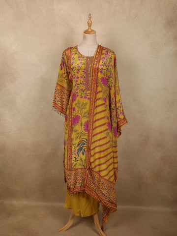 Mustard Yellow Crepe Straight Cut Salwar Suit Adorned with Floral Prints, paired with Dupatta - Diadem
