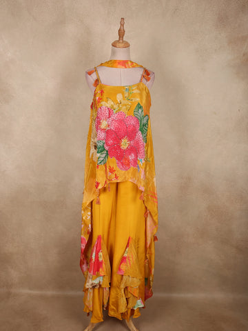 Mustard Yellow Crepe Anarkali Salwar Suit with Floral Prints Paired with Dupatta and Waist Belt - Diadem