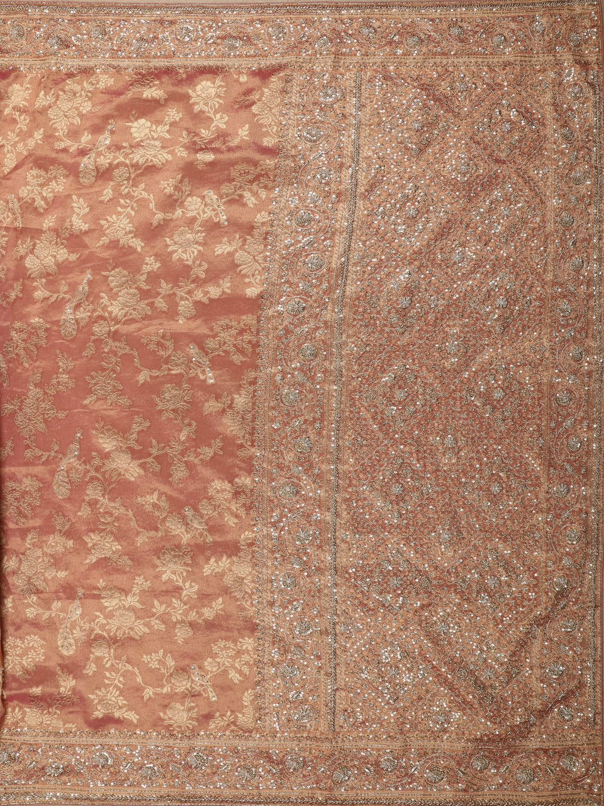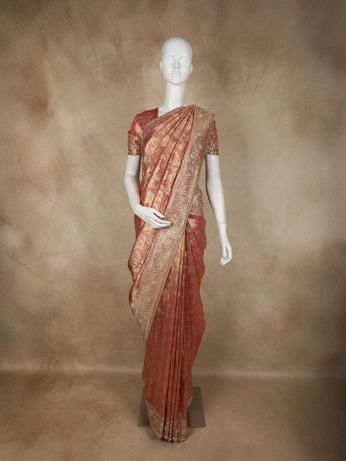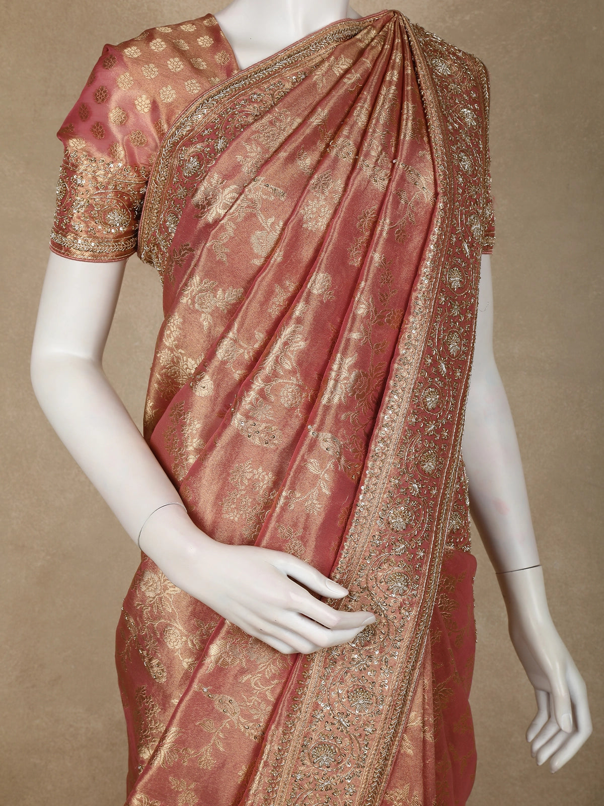 Antique Copper Peach Floral Zari Woven Design Tissue Banarasi Designer Saree with Designer Border