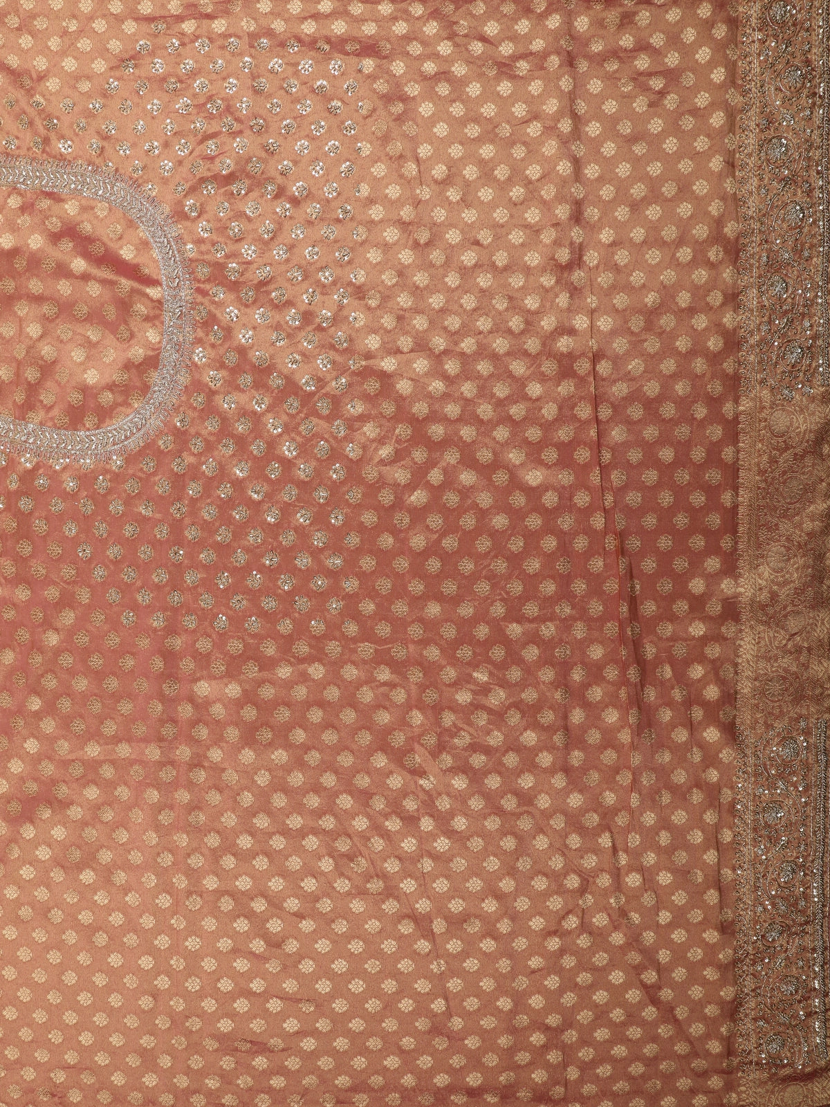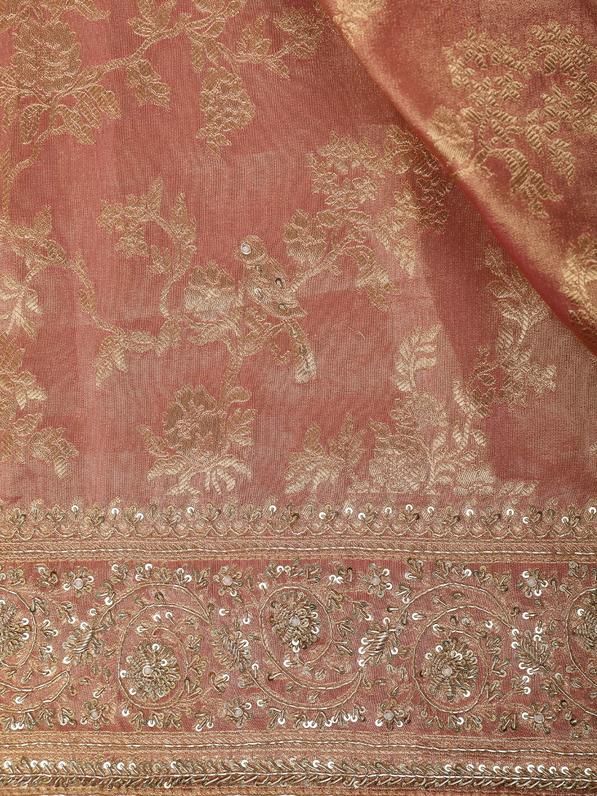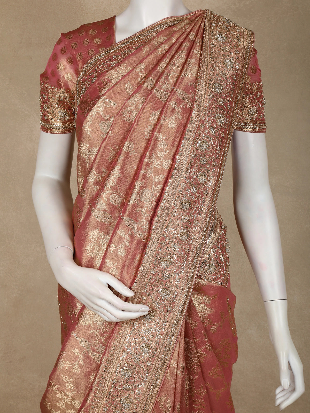 Antique Copper Peach Floral Zari Woven Design Tissue Banarasi Designer Saree with Designer Border