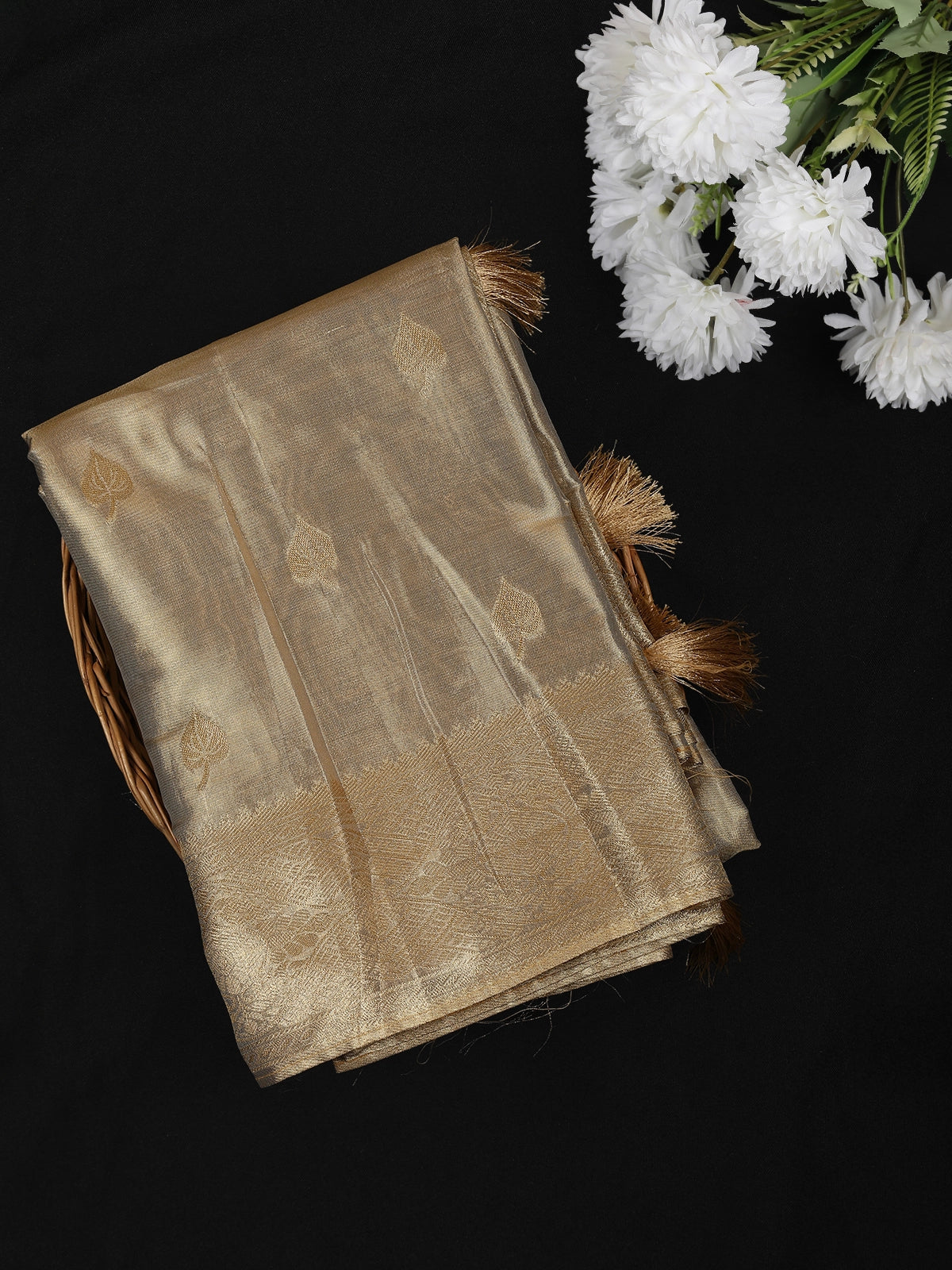 Crafted from premium tissue silk, the saree offers a feather-light drape with a rich, glossy finish that looks effortlessly elegant in motion. The look is elevated by a finely detailed antique gold zari border, lending a classic touch, while the stylish tassels on the pallu bring in a contemporary charm. Perfect for festive occasions, receptions, evening functions, and elegant celebrations, this saree pairs beautifully with antique, pearl, or minimal gold jewellery for a poised and graceful ethnic ensemble.