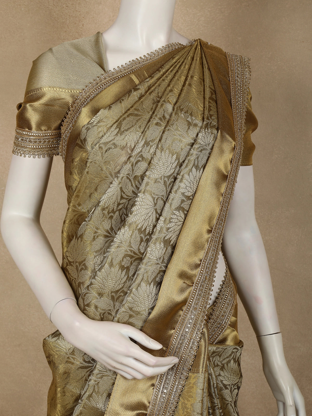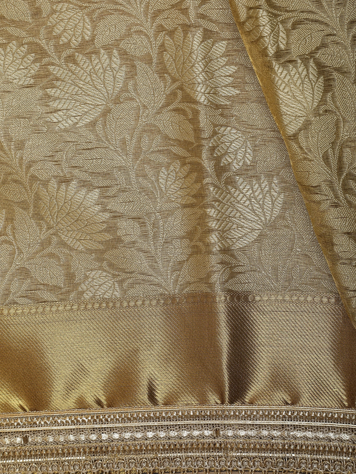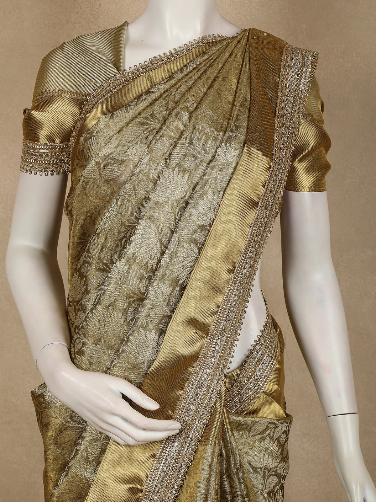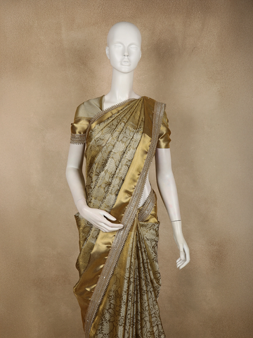 The body features intricate floral zari weaving, creating a rich textured surface that shimmers delicately with every movement. The antique gold tone enhances its heritage appeal, making it an ideal choice for grand celebrations. Accentuating the saree is a designer zari border, exquisitely detailed to add depth, contrast, and a statement finish.