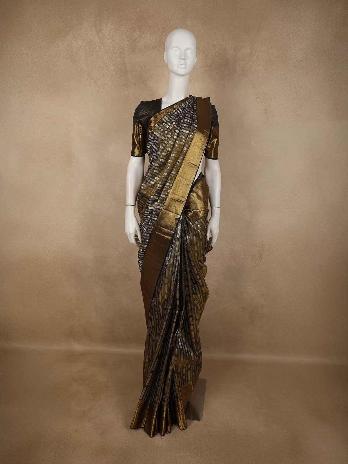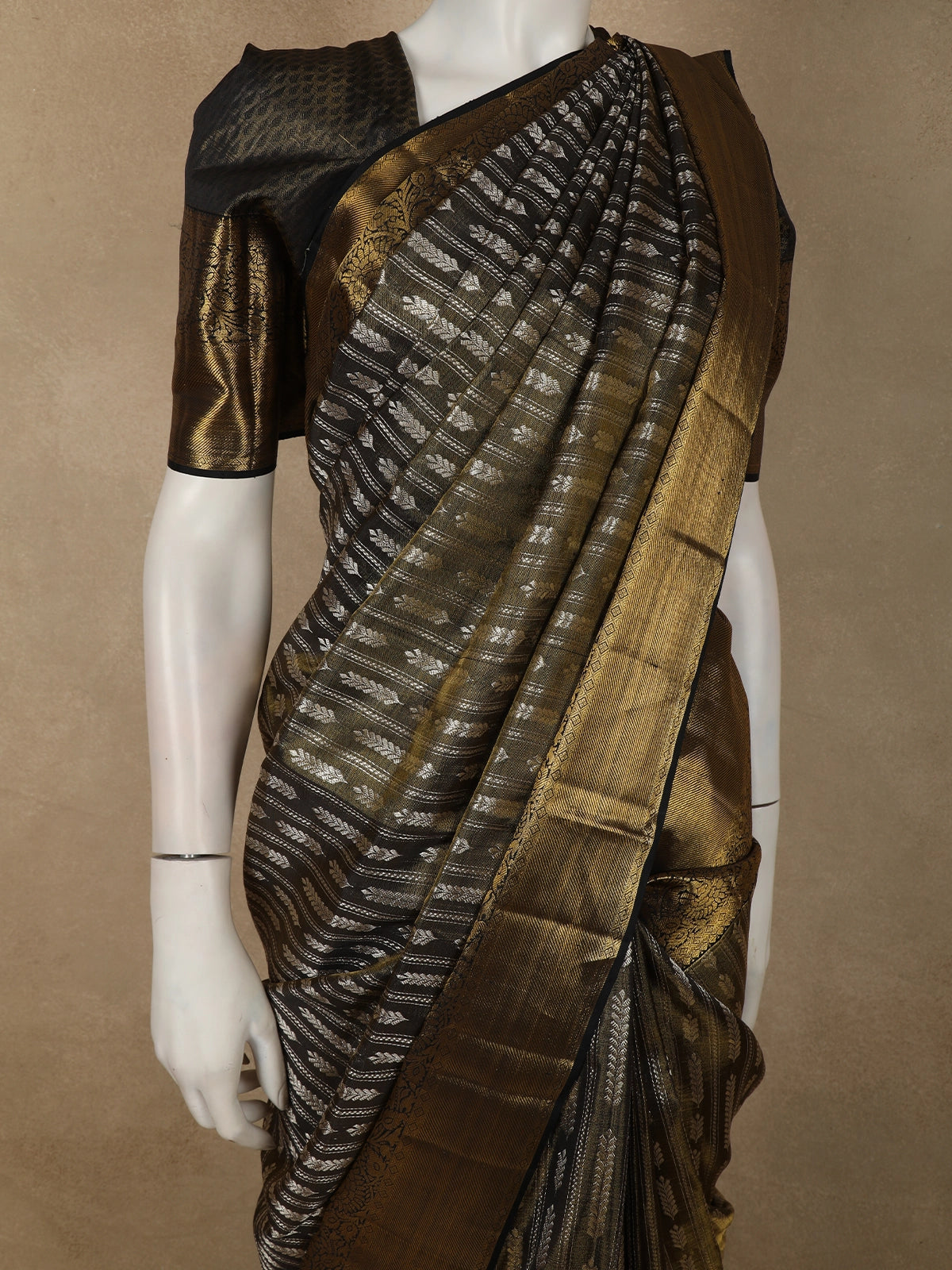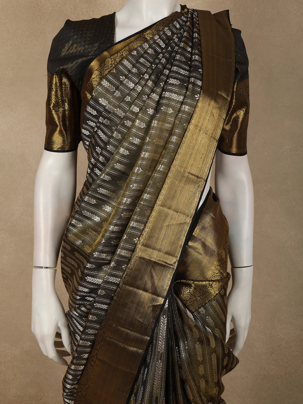 The saree features intricately woven striped patterns, enhanced with antique gold zari that adds texture and a gentle shimmer across the body. Subtle silver-toned highlights interwoven within the stripes lend a contemporary touch while preserving the heritage charm of authentic Kanchipuram craftsmanship.