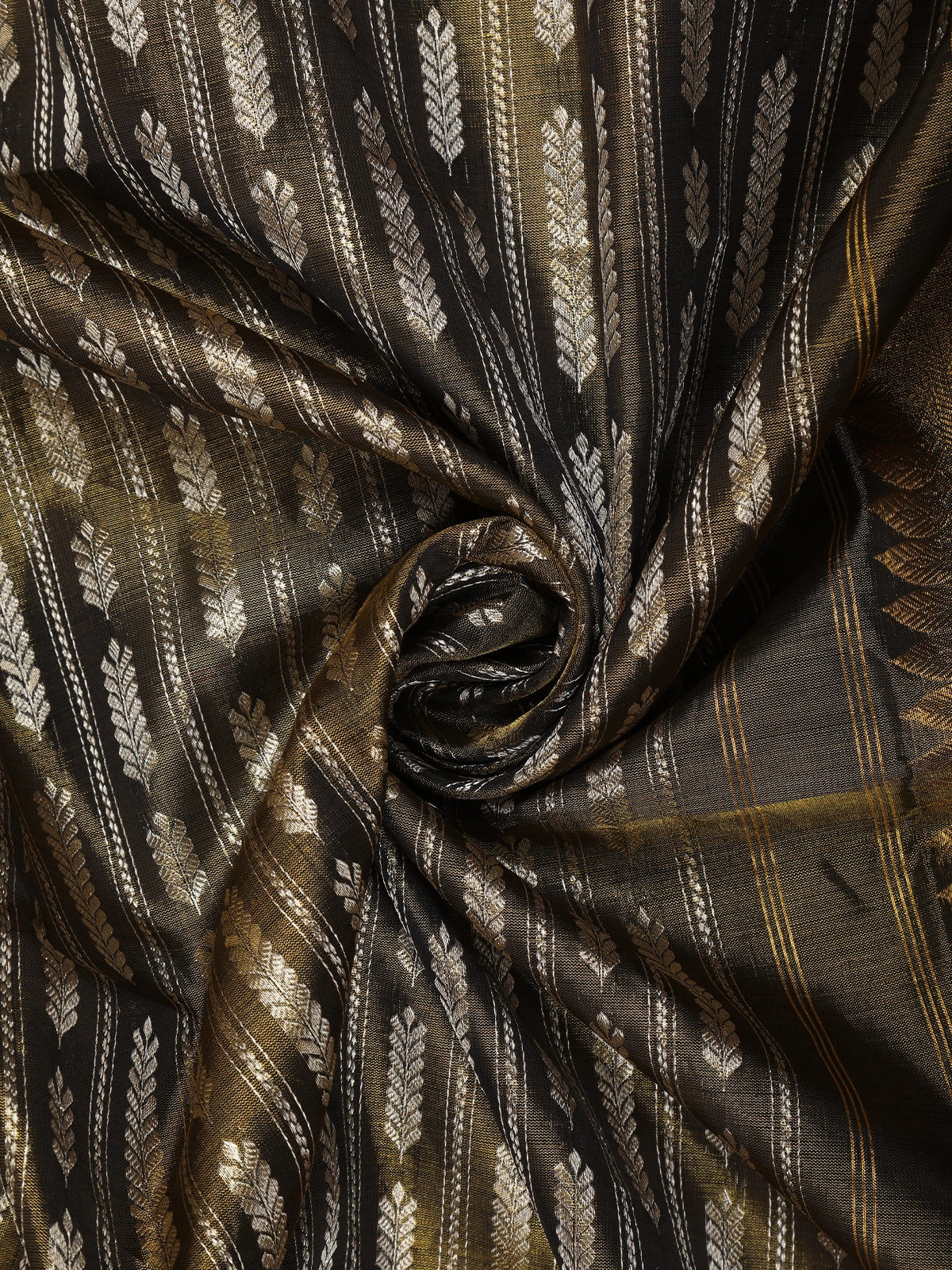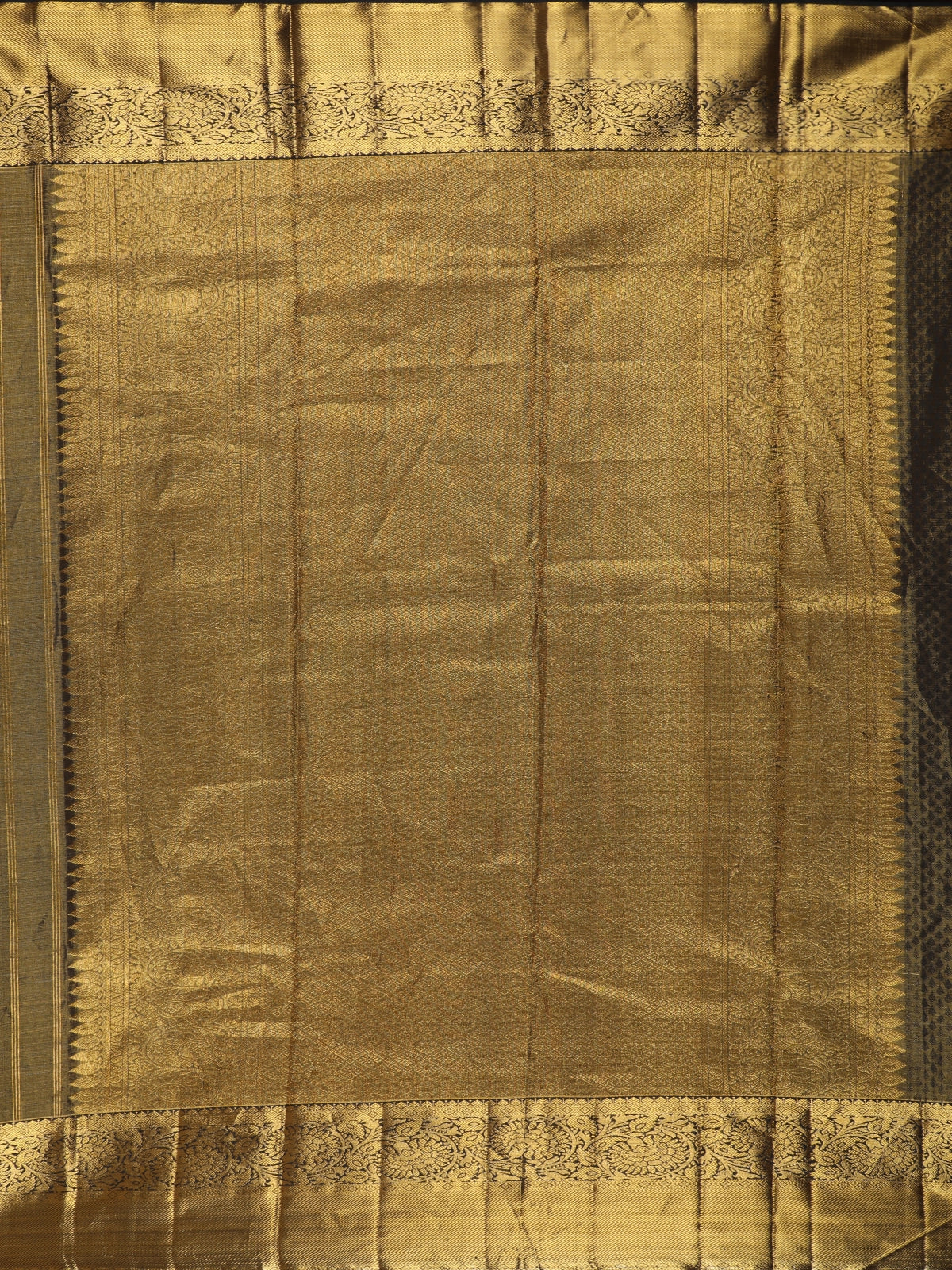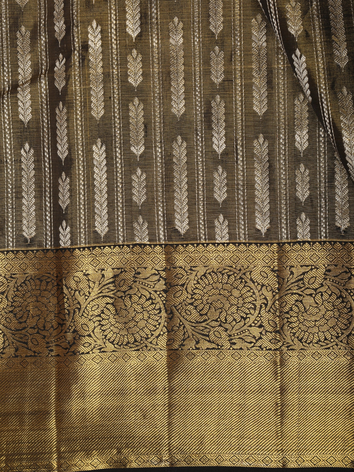 The saree features intricately woven striped patterns, enhanced with antique gold zari that adds texture and a gentle shimmer across the body. Subtle silver-toned highlights interwoven within the stripes lend a contemporary touch while preserving the heritage charm of authentic Kanchipuram craftsmanship.
