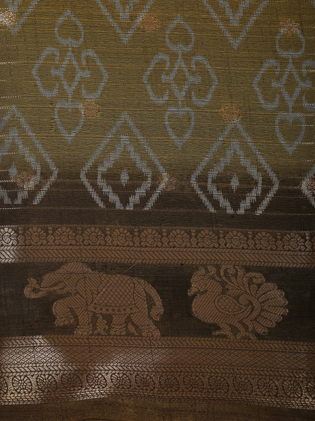 Antique Olive Moss Green Ikat Printed Design Semi Silk Saree with Contrast Animal Motif Border