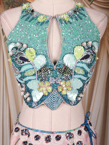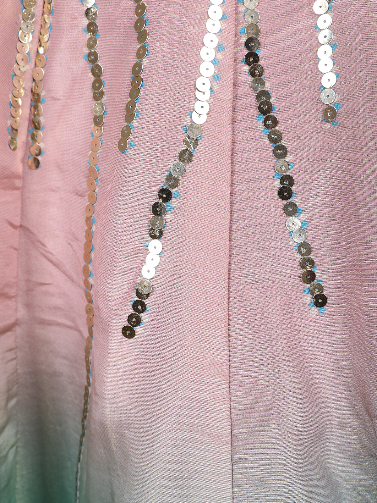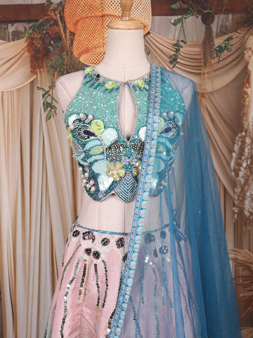 Aqua Blue and Blush Pink Sequins and Bead Embroidered Tissue Silk Lehenga Set