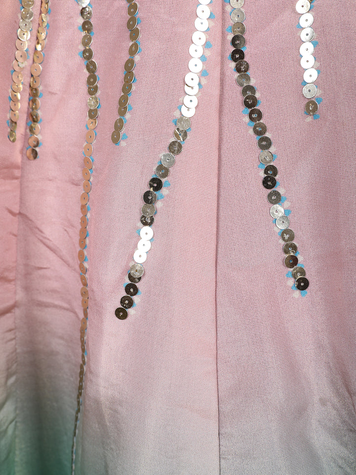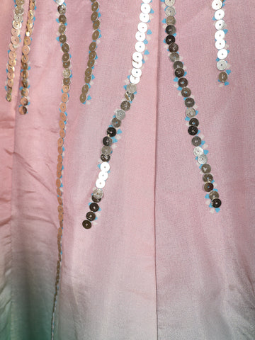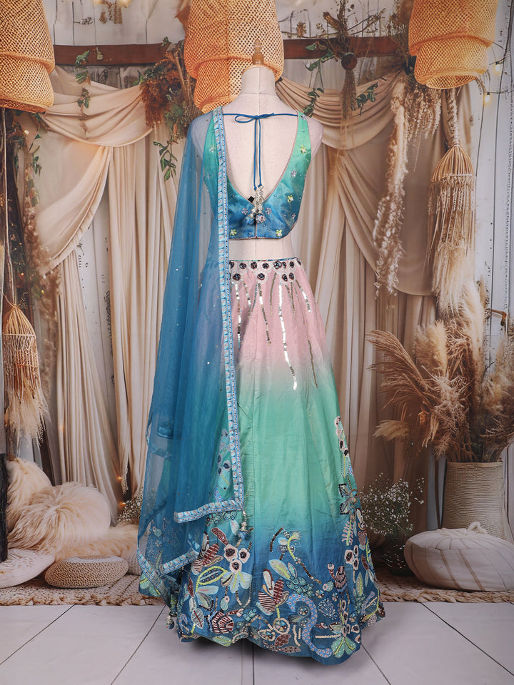 Step into a dreamy celebration look with this stunning aqua blue and blush pink lehenga set. The sleeveless blouse features an intricately hand-embroidered design with sequins, pearls, beads, and floral appliqués, highlighted by a graceful keyhole neckline and scalloped hem. The lehenga showcases a beautiful ombré gradient from soft blush pink to ocean blue, accentuated with shimmering sequin motifs and floral embroidery near the hem. A sheer blue net dupatta with embroidered borders completes the look with a touch of ethereal charm.