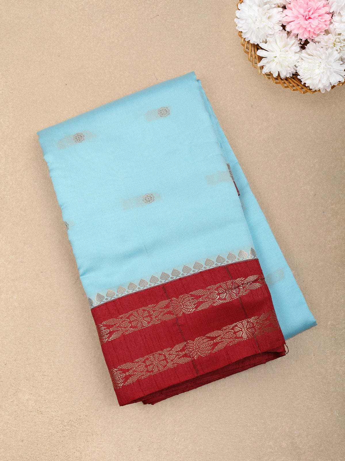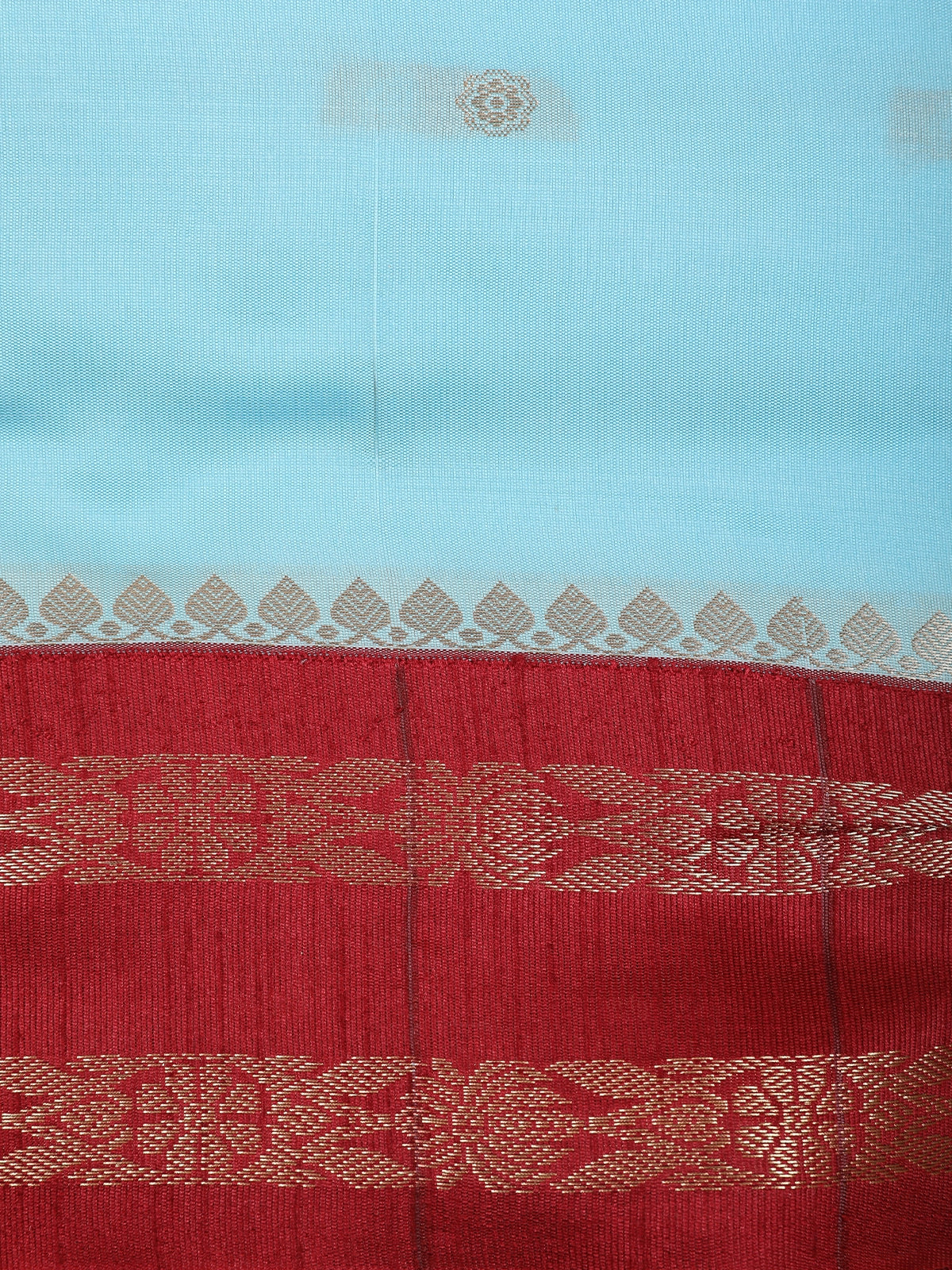 Graceful and refreshing, this Aqua Blue Soft Silk Saree is adorned with delicate gold zari butta woven motifs that add a subtle shimmer across the body. The soft silk fabric offers a smooth texture and elegant fall, making it a perfect choice for refined festive and fancy wear.