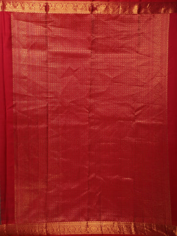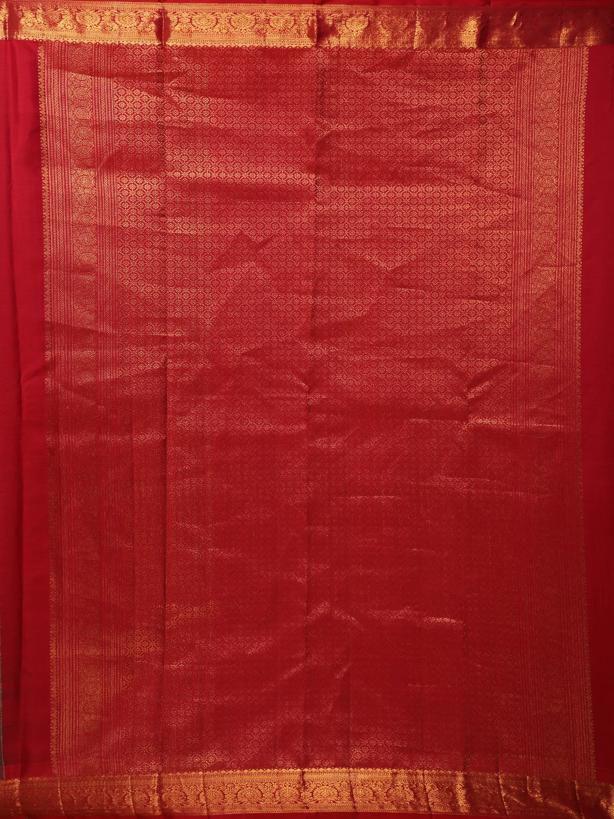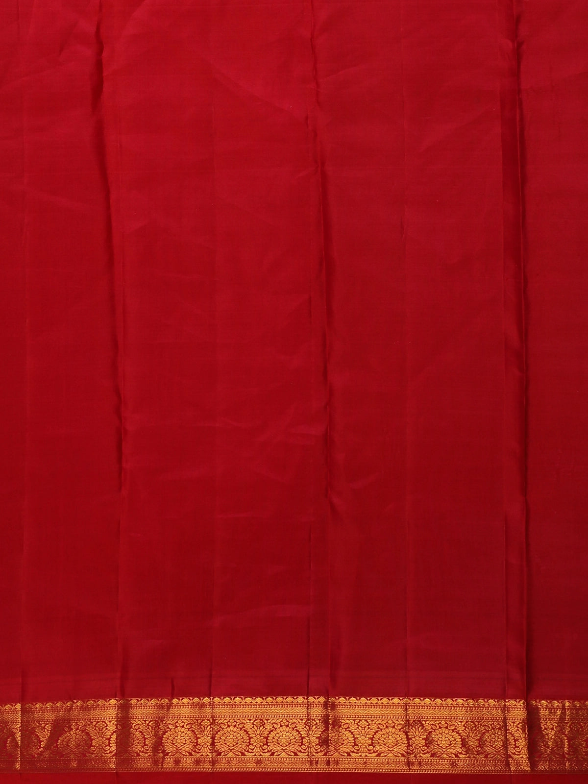 Complementing the body is a striking contrast border, intricately woven with traditional gold zari patterns that add grandeur and definition to the saree. The matching contrast pallu further elevates the look with detailed zari work, making it a perfect choice for auspicious occasions.