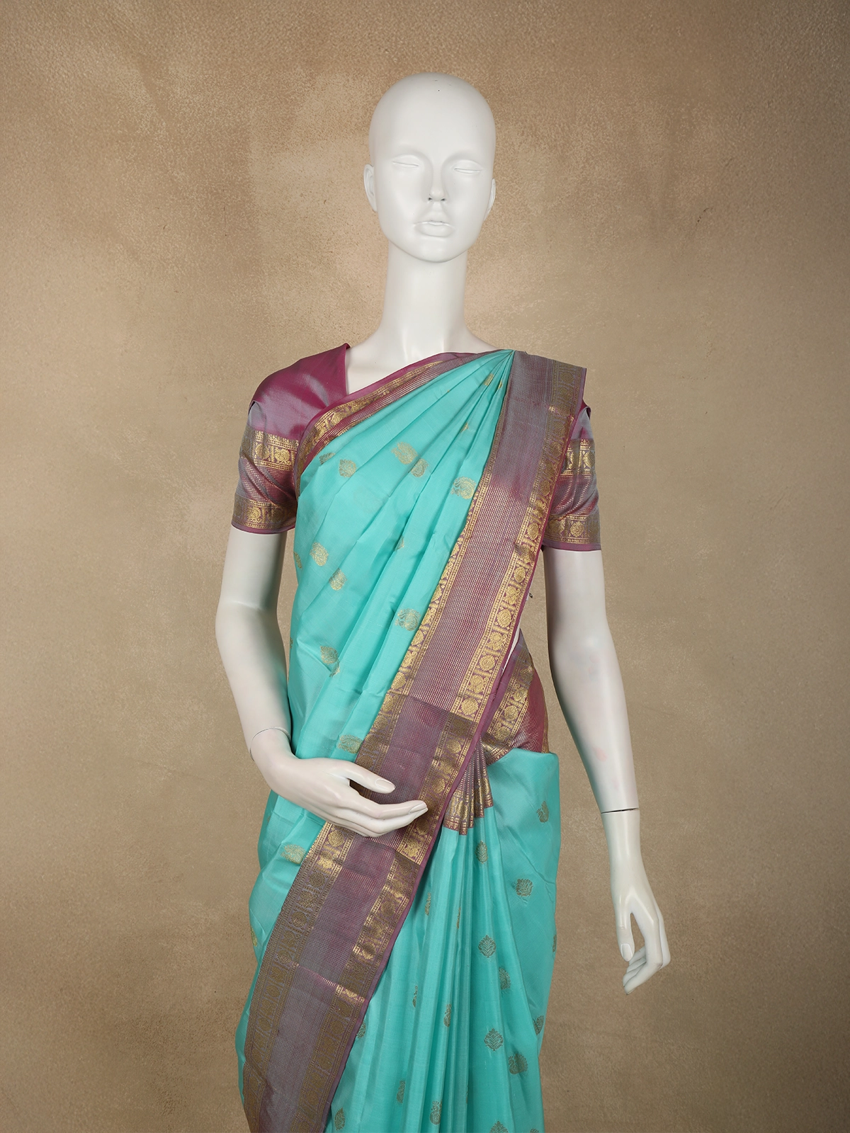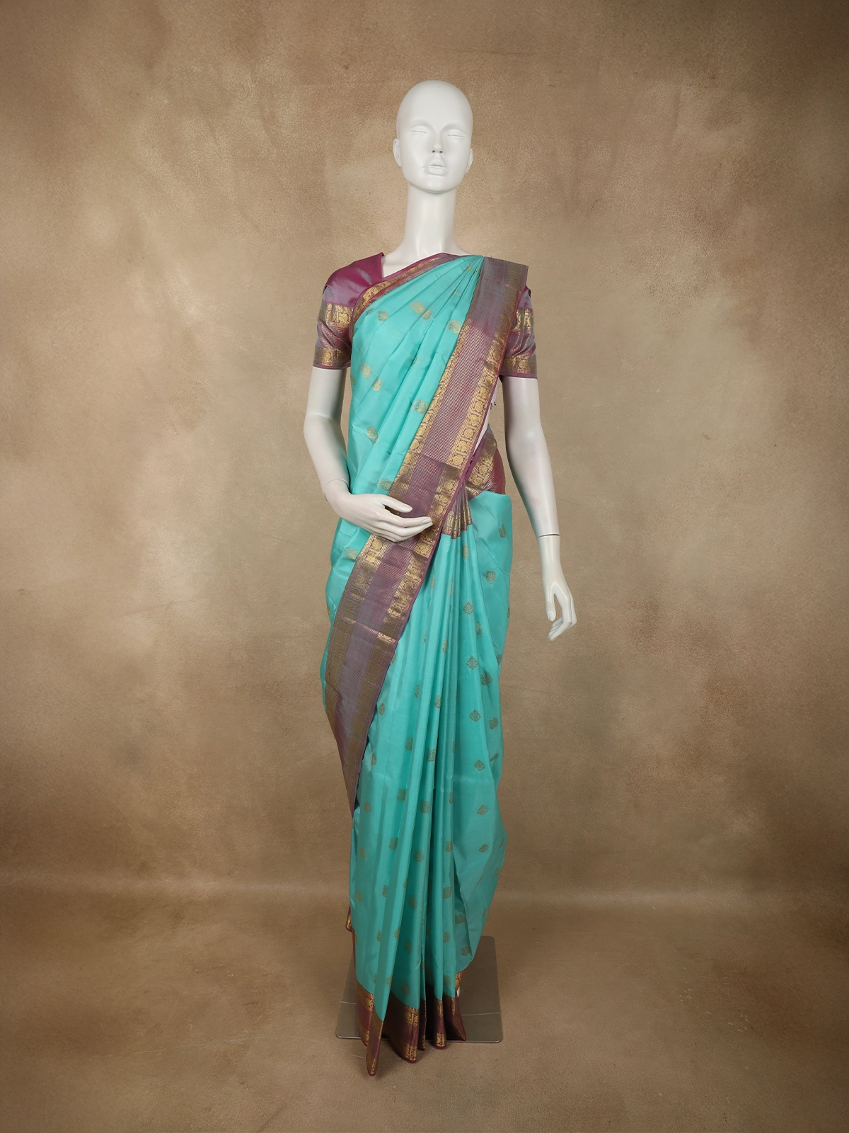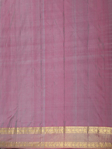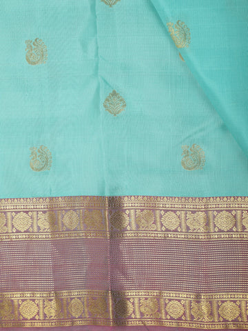 Enhancing its appeal is the contrast lavender-purple zari border, intricately crafted with traditional motifs that highlight authentic Kanchipuram craftsmanship. The harmonious blend of cool aqua tones with muted purple and gold accents lends the saree a unique, sophisticated character.