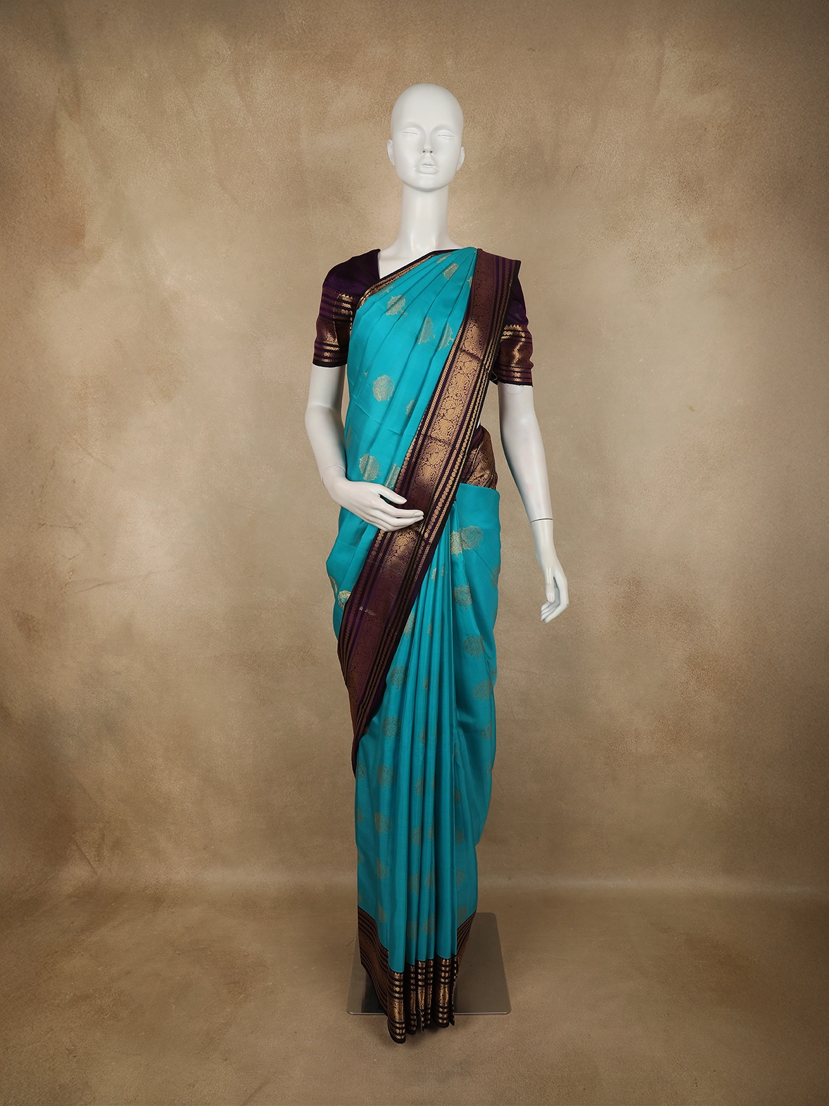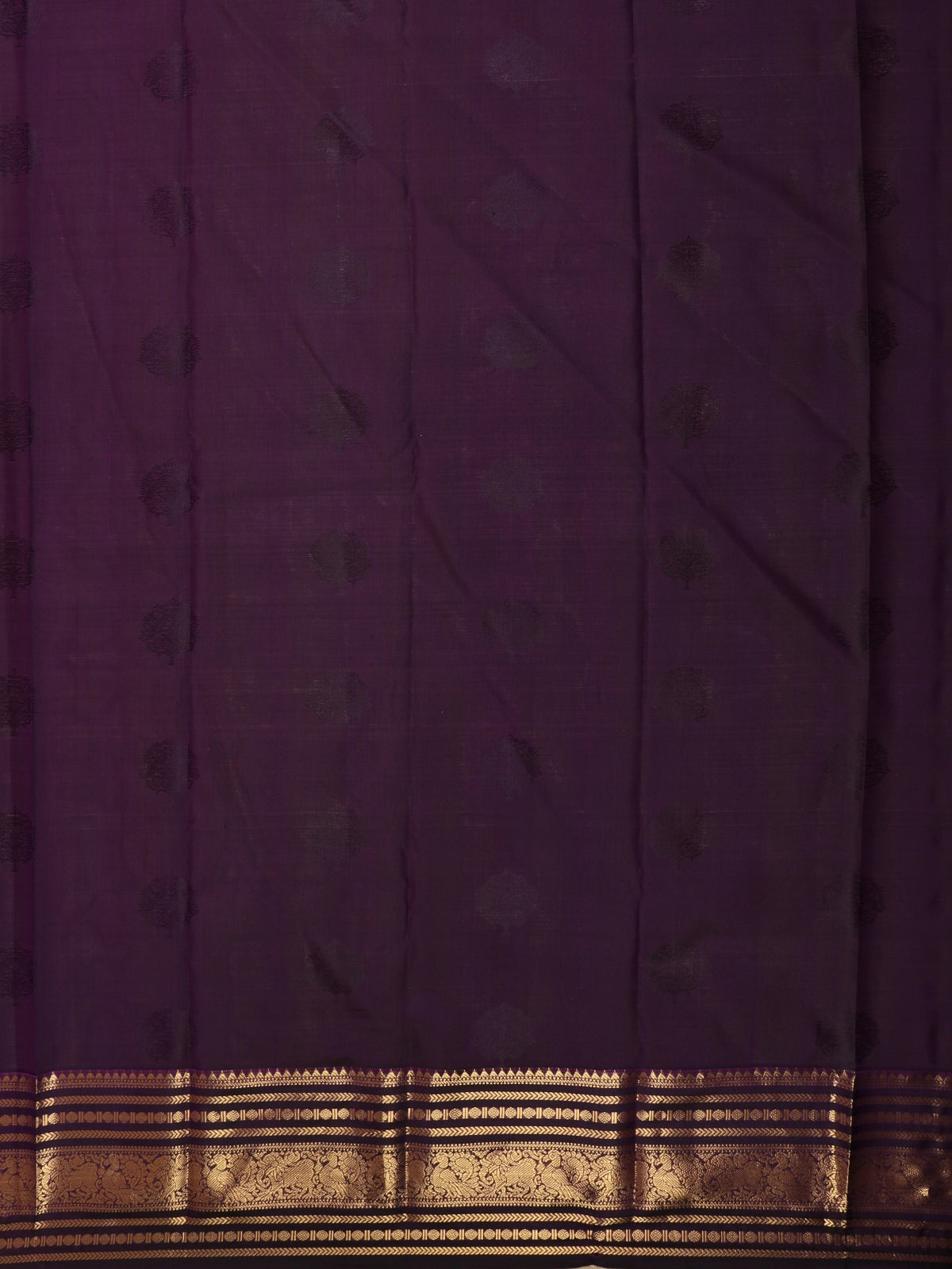 Enhancing its grandeur is a striking contrast zari border in deep brown-maroon tones, intricately woven with traditional motifs in rich gold zari. The border lends depth and definition to the saree, creating a regal frame that elevates the overall look. The luxurious pure Kanchipuram silk weave offers a rich texture, natural sheen, and a structured drape that holds its pleats beautifully.
